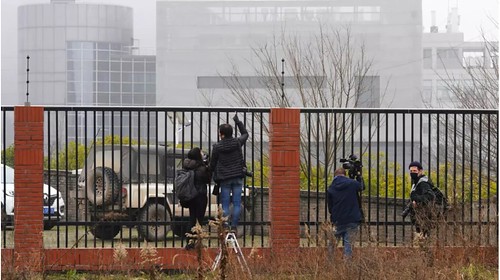 Các nhà báo tập trung trước hàng rào điện bao quanh phòng thí nghiệm P4 của Viện Vi trùng học Vũ Hán, khi ê-kíp của Tổ chức Y tế Thế giới (WHO) đến thăm ngày 03/02/2021. AP - Ng Han Guan
