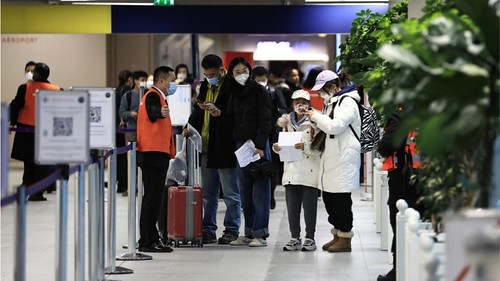 Hành khách từ Trung Quốc chờ đợi trước khu vực xét nghiệm Covid của phi trường Roissy Charles de Gaulle, phía bắc Paris ngày 01/01/2023. AP - Aurelien Morissard