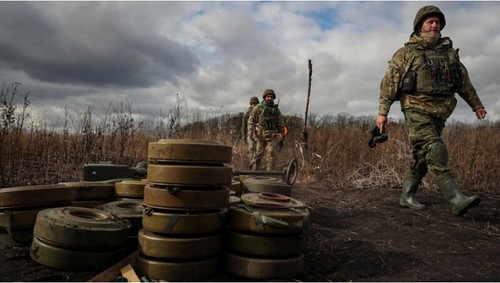 Các binh sĩ của đơn vị rà phá bom mìn gần thị trấn Izum, vùng Kharkiv, Ukraine, ngày 24/10/2023. Reuters - Stringer
