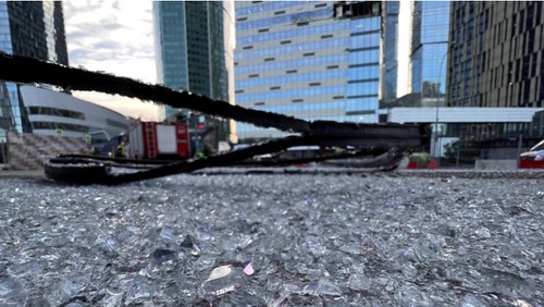 Kính vỡ nát gần một tòa nhà văn phòng ở khu kinh doanh Moskva City do bị drone Ukraine tấn công ngày 30/07/2023. Reuters - Stringer