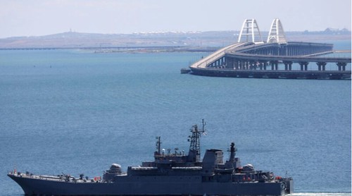 Một tàu đổ bộ của hải quân Nga được điều đến chở các xe hơi qua eo biển Kerch ở gần cầu Crimea, mà một đoạn đã bị hư hại trong vụ tấn công được cho là của drone hải chiến, ngày 17/07/2023. Reuters – Alexey Pavlishak