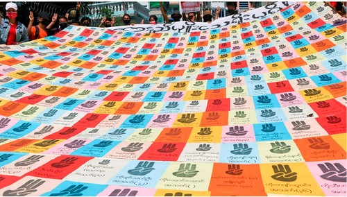 Biểu tượng của phong trào phản kháng Miến Điện, tại thị trấn Kamayut gần Rangoon, ngày 11/04/2021. AP