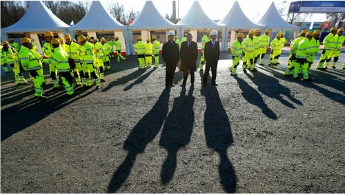 Tuyến đường xe lửa nối Budapest (Hungary) với Beograd (Serbia) do Trung Quốc tài trợ tái thiết, là dự án hàng đầu nhằm gia tăng ảnh hưởng Bắc Kinh tại Châu Âu. Trong ảnh minh họa : Công nhân và quan chức dự lễ khánh khánh thành ngày 28/11/2017. AP - Darko Vojinovic