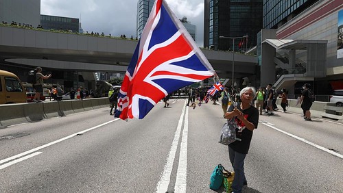 Một người cầm cờ Anh đi biểu tình chống luật dẫn độ tại trung tâm Hồng Kông, ngày 21/06/2019. Reuters/Ann Wang