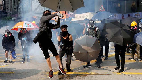 Một thanh niên chụp lựu đạn cay quăng trở lại, trong cuộc biểu tình ở Hồng Kông ngày 20/10/2019. Rzeuters/Kim Kyung-Hoon