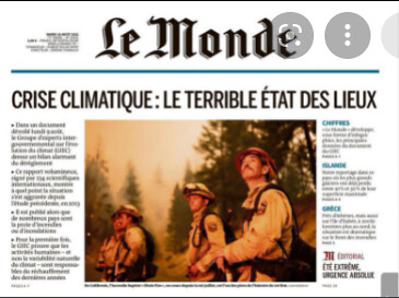 Libération đăng ảnh một đoạn đường cao tốc bị tàn phá nghiêm trọng sau trận lũ lụt, cảnh báo "Khí hậu, bên bờ vực thẳm". Nhật báo kinh tế Les Echos trên nền ảnh xanh biếc là những tản băng trôi, khẳng định không chút do dự "Khí hậu, sự biến đổi là đã không thể đảo chiều".
