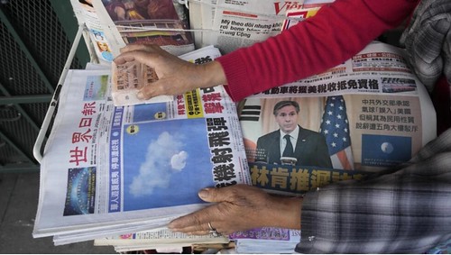 Báo chí tiếng Hoa và tiếng Việt bày bán ở khu Chinatown, Los Angeles (Hoa Kỳ) ngày 05/02/2023 viết về vụ khinh khí cầu gián điệp của Trung Quốc. AP - Damian Dovarganes