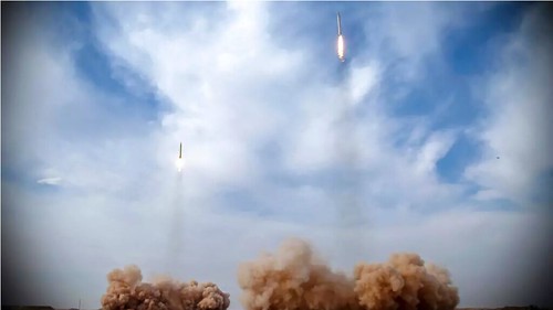Hình ảnh do Vệ binh Cách mạng Iran công bố ngày 16/01/2021 cho thấy các hỏa tiễn đạn đạo được bắn đi trong một cuộc tập trận. AP