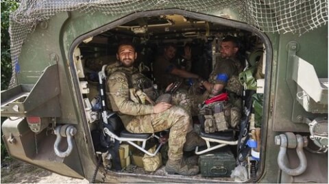 Các quân nhân Ukraine sau khi làm nhiệm vụ tại tỉnh Kursk (Nga) trở về thành phố Sumy (Ukraine) gần biên giới ngày 14/08/2024. AP – Yevgeny Maloletka