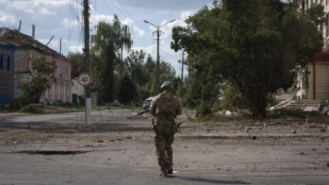 Một quân nhân Ukraine tuần tra tại trung tâm thành phố Sudzha thuộc tỉnh Kursk của Nga, ngày 16/08/2024. AP