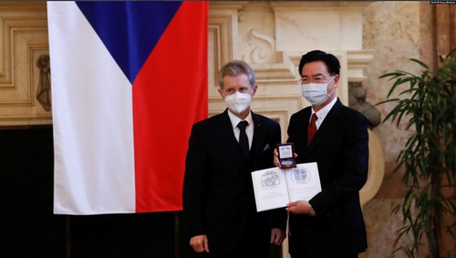 Chủ tịch Thượng viện Cộng hòa Czech Milos Vystrcil (trái) trao tặng ngoại trưởng Đài Loan Ngô Chiêu Tiếp (Joseph Wu) Huy chương Bạc, danh hiệu cao quý nhất của Thượng Viện, trong chuyến thăm Thượng Viện Cộng hòa Czech ở Praha, ngày 27/10/2021. AP - Petr David Josek