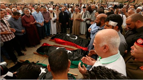 Cầu nguyện cho những người lính bị tử thương trong vụ không kích ở Tripoli, Libya ngày 24/04/2019. Chính quyền Libya được Liên Hiệp Quốc ủng hộ cho biết có bằng chứng 800 lính Wagner đánh thuê cho phe đối địch. AP - Hazem Ahmed