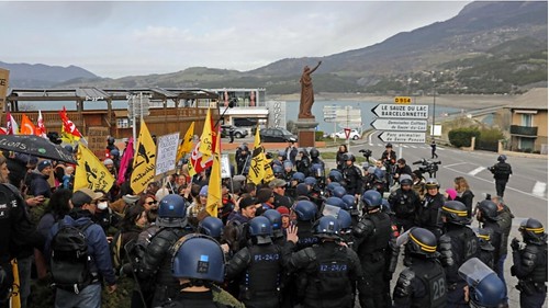 Các đại diện nghiệp đoàn phản đối tổng thống Pháp Emmanuel Macron, tại Savines-Le-Lac, ngày 30/03/2023, khi tổng thống Pháp đến công bố kế hoạch nước via Reuters - Pool