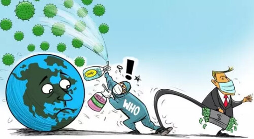 Tổng thống Mỹ Donald Trump ngừng đóng góp tài chính cho Tổ chức Y tế Thế giới với lý do định chế này để cho dịch Covid-19 lây lan khắp thế giới. © RFI - Tranh biếm họa