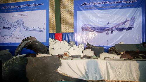 Những mãnh của chiếc drone Mỹ bị tên lửa Iran bắn rơi được trưng bày tại Tehran ngày 21/06/2019. Tasnim News Agency/Handout via Reuters