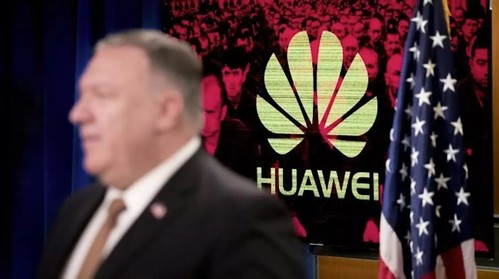Ngoại trưởng Mỹ Mike Pompeo và phía sau là logo của tập đoàn tin học Trung Quốc Hoa Vi, trong cuộc họp báo tại bộ Ngoại Giao Hoa Kỳ, Washington DC, ngày 15/07/2020. AFP