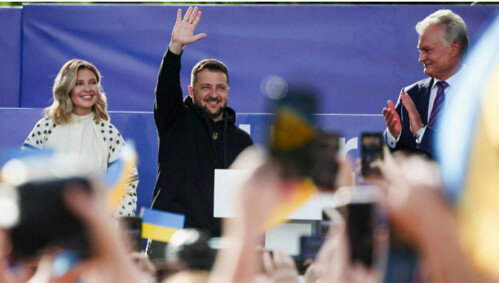 Tổng thống Ukraine Volodymyr Zelensky cùng với phu nhân Olena Zelenska, và tổng thống Litva Gitanas Nauseda trong lễ trao tặng một lá quốc kỳ Ukraine từ tiền tuyến, bên lề hội nghị thượng đỉnh NATO ở Vilnius (Litva) ngày 11/07/2023. Reuters – Kacper Pempel
