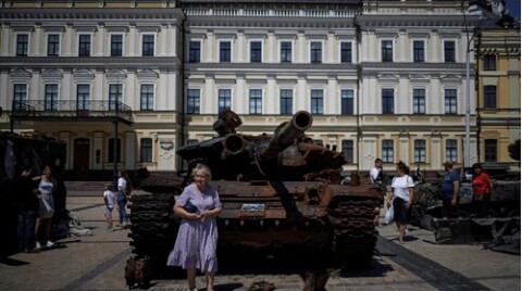 Xe tăng và vũ khí của quân Nga bị Ukraine phá hủy được triển lãm ở quảng trường Mykhailivska ở Kiev, Ukraine, ngày 23/07/2022. Reuters - Alkis Konstantinidis