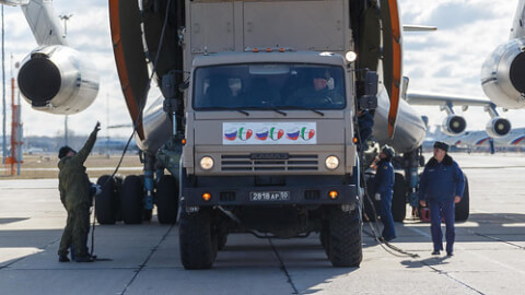 Le Figaro ghi nhận là cùng với Trung Quốc, Nga là nước đầu tiên đã đáp ứng lời cầu cứu của Ý, đang bị đại dịch Covid-19 tàn hại. Bộ Quốc phòng Nga đã quảng cáo và tuyên truyền rầm rộ cho việc dùng máy bay vận tải quân sự chở sang Ý tám đoàn y tế và một trăm quân nhân bổ sung để tham gia chống dịch. Các nhà vi trùng học, các chuyên gia về chiến tranh sinh học, các loại thiết bị và phòng thí nghiệm khử trùng của Nga sẽ "giúp Ý giành chiến thắng" trong cuộc chiến chống Covid-19.