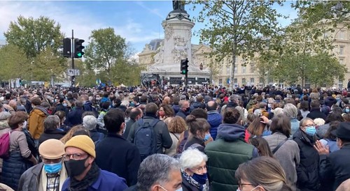 Dân chúng tập hợp tại quảng trường Cộng Hòa (place de la République, Paris) tưởng niệm giáo viên Samuel Paty, ngày 18/10/ 2020. RFI/Alexandra Cagnard