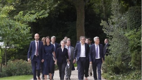 Phái đoàn liên minh cánh tả NFP đến điện Elysée để hội đàm với tổng thống Pháp Emmanuel Macron. Ảnh chụp tại Paris, Pháp, ngày 23/08/2024. AP - Thibault Camus