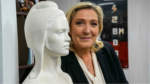 Ứng cử viên tổng thống cực hữu của Pháp, bà Marine Le Pen, chụp ảnh bên bức tượng bán thân Marianne, biểu tượng của nền Cộng Hòa Pháp. Ảnh chụp trong lễ khánh thành trụ sở tranh cử ở Paris, ngày 15/11/2021. AP - Michel Euler
