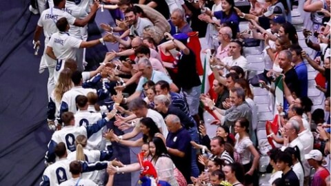 Các vận động viên Pháp chạm tay chào thân ái khán giả trong lễ bế mạc Thế vận hội Paris tại sân vận động Stade de France ở Saint-Denis, đêm 11/08/2024. Reuters - Tingshu Wang