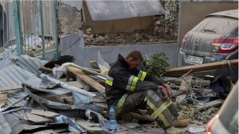 Một nhân viên cứu hộ Ukraine tạm nghỉ ngơi cạnh một tòa nhà dân ở Lviv bị hỏa tiễn và drone Nga tấn công, ngày 04/09/2024. Reuters - Roman Baluk