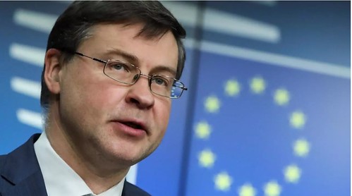 Phó chủ tịch Ủy Ban Châu Âu Valdis Dombrovskis trả lời phỏng vấn của hãng tin Pháp AFP ngày 05/05/2021. Yves Herman Pool/AFP/File