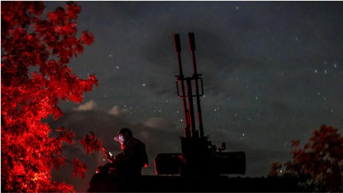 Một quân nhân Ukraine thuộc một đơn vị phòng không cơ động chống drone bên cạnh một đại bác phòng không ZU-23-2 đang canh chừng các drone tự sát của Nga tại Kherson, Ukraine, ngày 11/06/2024. Reuters - Ivan Antypenko