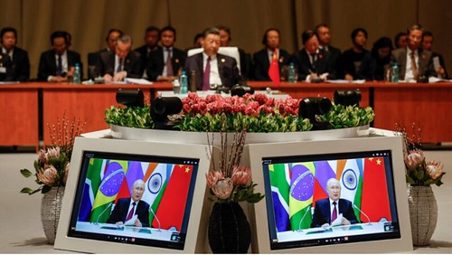 Chủ tịch Trung Quốc Tập Cận Bình dự thượng đỉnh BRICS ở Johannesburg (Nam Phi) trong khi tổng thống Nga Vladimir Putin phát biểu qua màn hình vì vướng lệnh truy nã quốc tế, ngày 23/08/2023 via Reuters - Pool