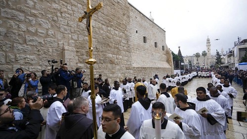 Các giáo sĩ Jerusalem bước vào Vương Cung Thánh Đường Giáng Sinh, ở thành phố Bethlem, ngày 24/12/2022. AP - Majdi Mohammed