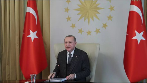 Tổng thống Thổ Nhĩ Kỳ, Recep Tayyip Erdogan, trong một cuộc họp trực tuyến với các lãnh đạo Liên Hiệp Châu Âu, ngày 19/03/2021. AP