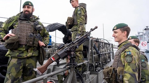 Các quân nhân Thụy Điển đi trên hai tàu chiến CB90 của Trung đoàn đổ bộ Stockholm để tham gia cuộc tập trận Nordic Response ở Alta (Na Uy), một ngày sau khi Thụy Điển trở thành thành viên của NATO, 08/03/2024. via Reuters - Heiko Junge