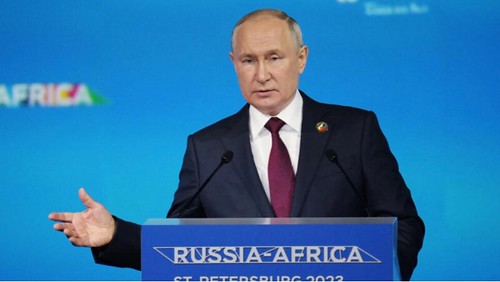 Tổng thống Nga Vladimir Putin phát biểu trong hội nghị thượng đỉnh Nga-Châu Phi tại Saint-Petersburg ngày 27/07/2023. via Reuters - Sputnik