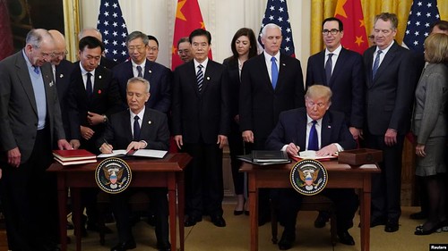 Tổng thống Mỹ Donald Trump và phó thủ tướng Trung Quốc Lưu Hạc (Liu He) trong buổi lễ ký kết thỏa thuận thương mại giai đoạn 1 tại Nhà Trắng ngày 15/01/2020. Reuters/Kevin Lamarque