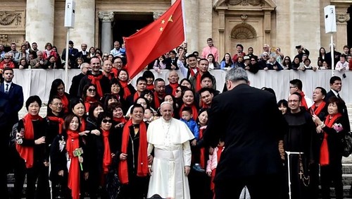 Giáo hoàng Francis chụp hình với các giáo dân đến từ Trung Quốc, ngày 18/04/2018, tại quảng trường thánh Phêrô. TIZIANA FABI / AFP