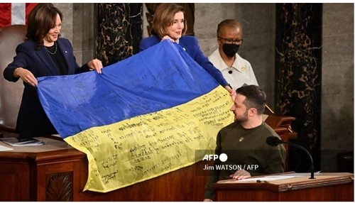 Tổng thống Zelensky tặng Quốc hội Mỹ lá cờ Ukraine ông mang từ Bakhmut đến Washington. Ảnh ngày 21/12/2022. AFP – Jim Watson