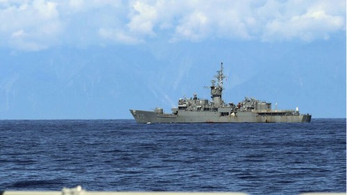 Tàu khu trục hải quân Đài Loan Lan Yang nhìn từ boong tàu quân sự Trung Quốc, ngày 05/08/2022. AP - Lin Jian