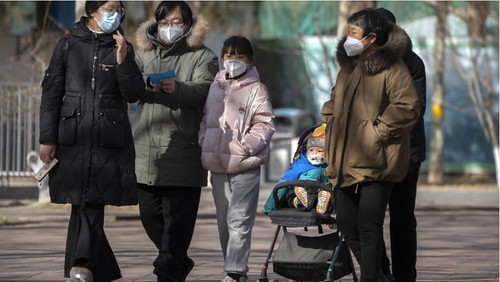 Những người lớn trong gia đình đi dạo cùng em bé trong một công viên ở Bắc Kinh ngày 17/01/2023. AP - Mark Schiefelbein
