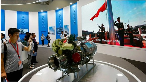 Khách tham quan xem các cơ phận máy bay trưng bày tại Triển lãm Hàng không Bắc Kinh. Ảnh tư liệu chụp ngày 04/04/2018. AP - Andy Wong
