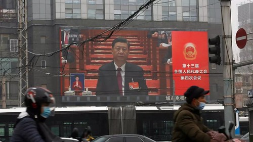 Chủ tịch Trung Quốc Tập Cận Bình trong buổi khai mạc kỳ họp Quốc hội tại Đại sảnh đường Nhân Dân, được chiếu lên màn hình lớn trên đường phố Bắc Kinh ngày 05/03/2021. Reuters - Tingshu Wang