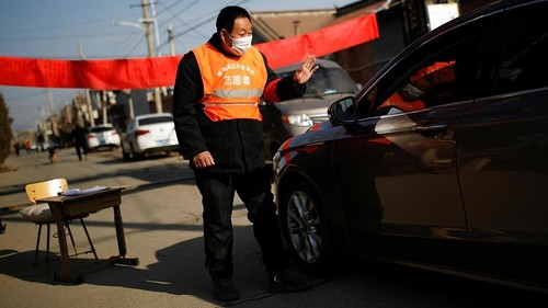 Một người dân ở Điền Gia Doanh (Tianjiayingcun), ngoại ô Bắc Kinh, Trung Quốc, kiểm tra xe hơi vào làng đề phòng dịch virus corona, ngày 29/01/2020 Reuters/Carlos Garcia Rawlins