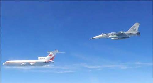 Một chiến đấu cơ F-CK-1 của Đài Loan hộ tống chiến đấu cơ quân đội Trung Quốc Tu-154M ra khỏi không phận. Ảnh do bộ Quốc Phòng Đài Loan cung cấp ngày 11/05/2018. AFP - Handout