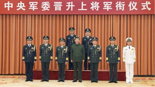 Chủ tịch Trung Quốc Tập Cận Bình (giữa) và tư lệnh Quân chủng hỏa tiễn Vương Hậu Bân (trên, bên trái), chính ủy Từ Tây Thịnh (trên, bên phải) tại Bắc Kinh,Trung Quốc, ngày 31/07/2023. AP - Li Gang