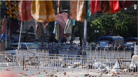 Váy của phụ nữ trở thành một công cụ kháng chiến của người dân Miến Điện, nhằm cản đà tiến của cảnh sát, quân đội. Ảnh chụp ngày Quốc Tế Phụ Nữ 08/03/2021
