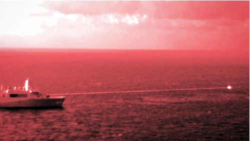 Ảnh hồng ngoại của thủy quân lục chiến Hoa Kỳ cho thấy chiến hạm USS Portland bắn tia laser vào một mục tiêu nổi trên Vịnh Aden ngày 14/12/2021. AP - Staff Sgt. Donald Holbert