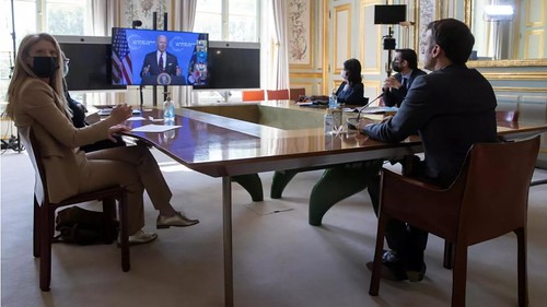 Tổng thống Pháp Emmanuel Macron nghe đồng nhiệm Mỹ Joe Biden phát biểu nhân Thượng đỉnh Khí hậu trực tuyến ngày 22/04/2021. Ảnh chụp tại điện Élysée ở Paris (Pháp). Reuters - Pool