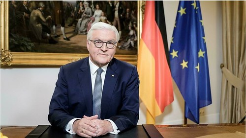 Tổng thống Đức Frank-Walter Steinmeier phát biểu, phía sau ông là quốc kỳ Đức và cờ của Liên Âu. POOL/AFP