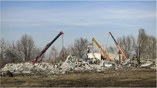 Công nhân dọn dẹp đống đổ nát sau cuộc tấn công bằng hỏa tiễn của Ukraine vào Makiivka, vùng Donetsk, làm hàng trăm lính Nga thiệt mạng. Ảnh chụp ngày 03/01/2022. AP